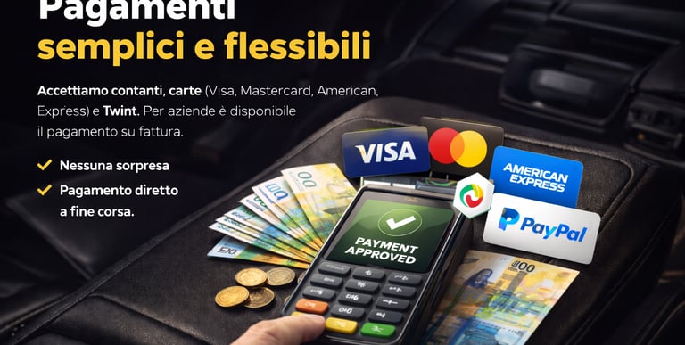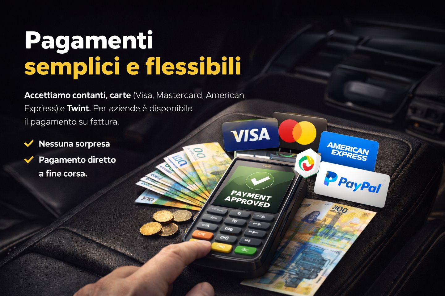 Accettiamo tutte le principali carte di credito (Visa, Mastercard, American Express), Twint e contanti.